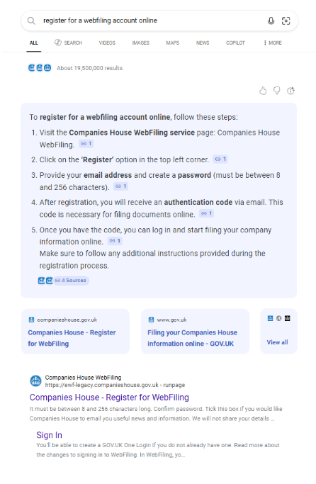 1.Search for ‘register for a webfiling account online’ and Select ‘Companies House –