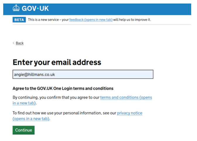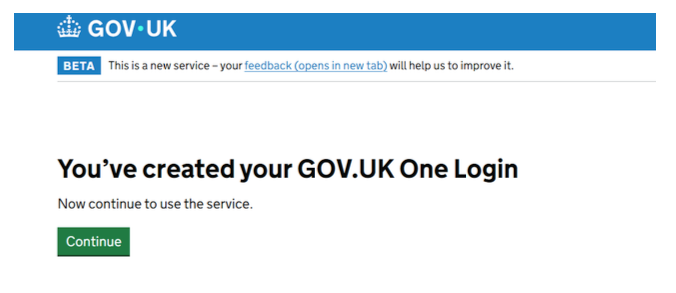 3. This will divert you to your one login account. Click the ‘Go to Gov.uk One login and select ‘Continue’ and sign into your Gov.Uk One account.