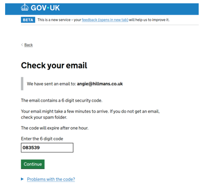 8. You will then be emailed a code to the email linked to your webfiling account, enter