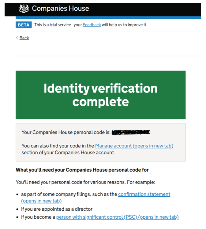 9. You should then be able to see your Companies House personal code